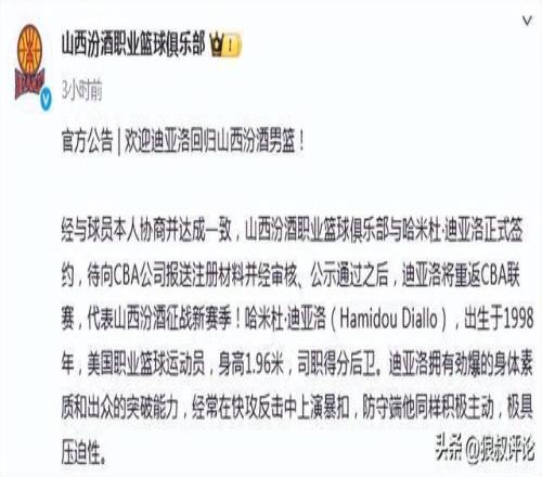 北京时间12月6日,根据山西男篮官方社媒公示,经与球员本人协商并达成一致,山西汾酒职业篮球俱乐部与哈米杜·迪亚洛正式签约,待向CBA公司报送注册材料并经审核、公示通过之后,迪亚洛将重返CBA联赛,代表山西汾酒征战新赛季。